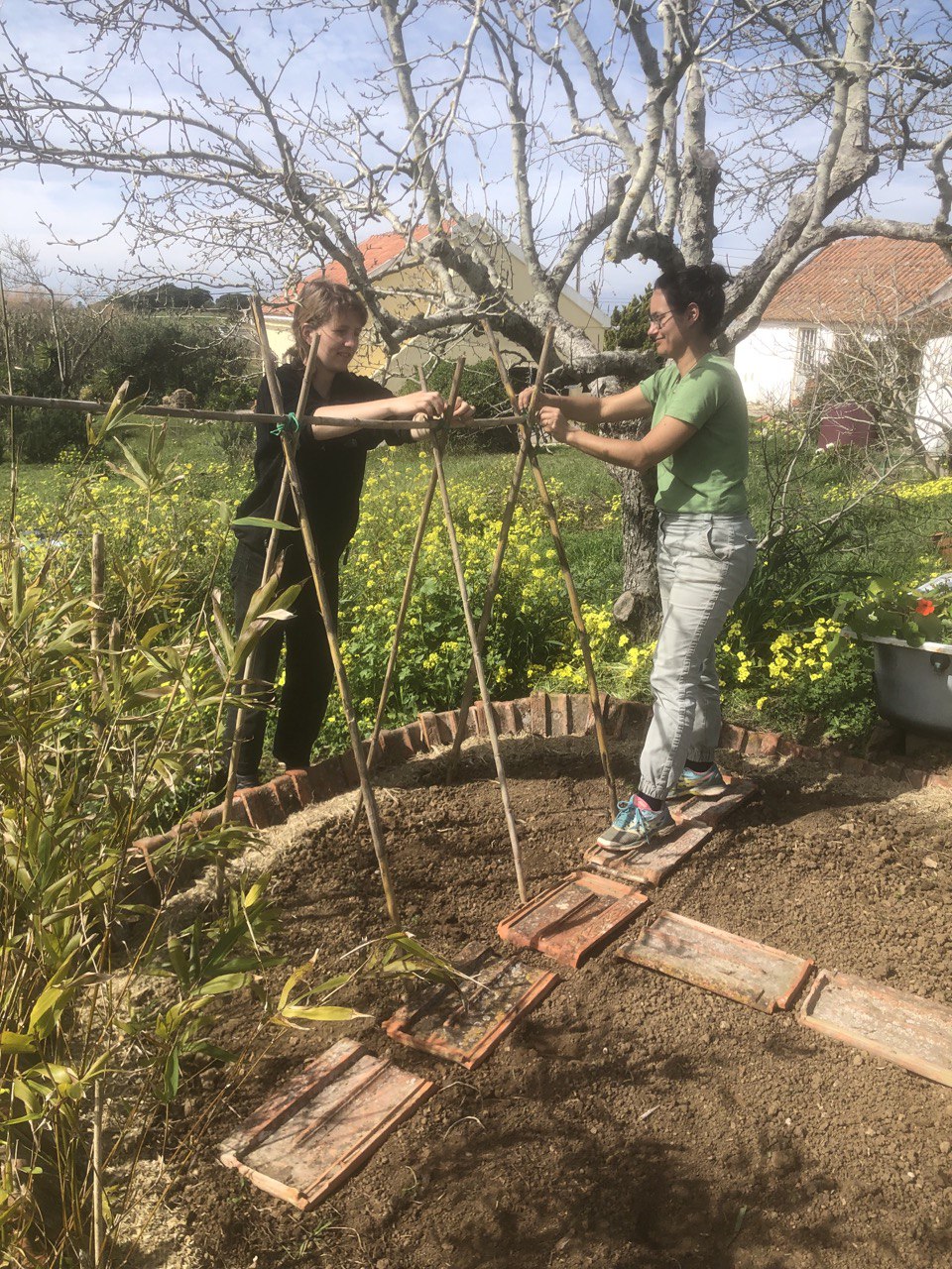 What good times we had ! The first week I suddenly hurt my left leg and could hardly walk. So we decided against all Syntropic odds (*) to create a separate vegetable plot because this would be an activity close to the house and because Marina, Matti’s energetic sister, could throw in some freshly acquired potato planting expertise. Seline, the other friend that came along for the first week, put her architectural skills in the mix and there we went.
